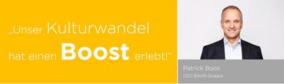 Welche Maßnahmen ergriffen wurden und warum die neuen Arbeitsweisen zu einem Boost für den internen Kulturwandel führen, klärt Stefan Gagel, Unternehmenskommunikation der BAUR-Gruppe, in einem zweiteiligen Interview mit dem Geschäftsführer der BAUR-Gruppe, Patrick Boos.