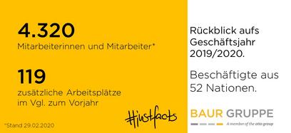 Das expandierende Dienstleistungsgeschäft und der damit verbundene erhöhte Personalbedarf in der Logistik führten zu einer weiteren Zunahme der Arbeitsplätze. Zum 29. Februar 2020 beschäftigte die BAUR-Gruppe 4.320 Mitarbeiterinnen und Mitarbeiter (i.V. 4.201). Davon 3.882 an den oberfränkischen Standorten und 438 in Österreich.
