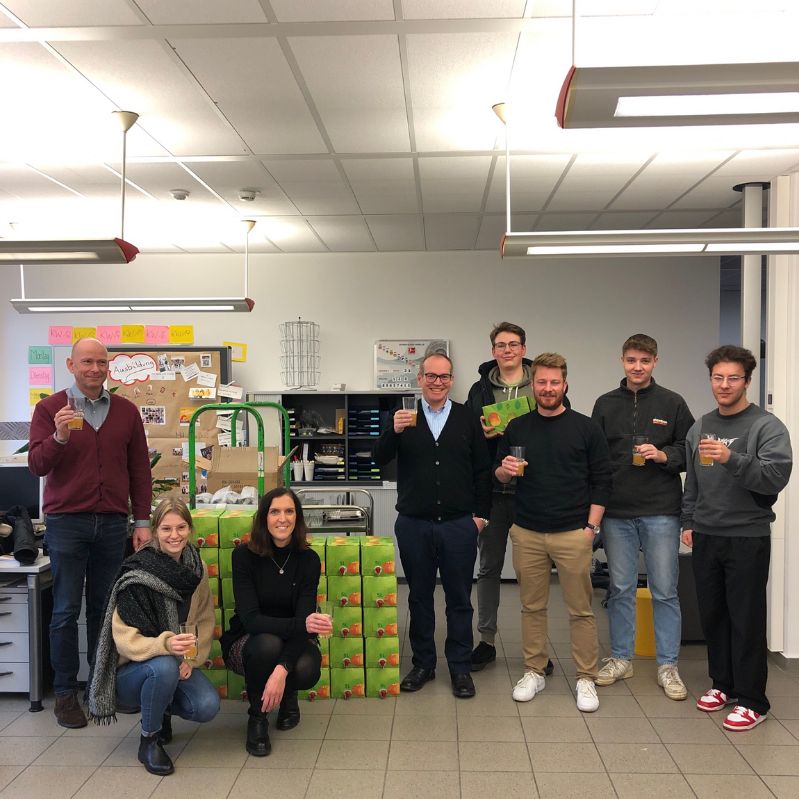 Es sind ganze 40 Beutel à 5 Liter, die nun im B.Our Shop an unsere Mitarbeiter*innen verkauft werden konnten. Zum Verkaufsstart kamen auch Geschäftsführer Hans-Christian Müller (4. v. l.) und Personalleiterin Carolin Schmidt (3. v. l.) vorbei, um den Bio-Apfelsaft zu verkosten.