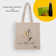 Der Bio-Apfelsaft aus selbst gepflückten Äpfeln wurde dabei nicht einzeln verkauft, sondern gemeinsam mit einer Bio-Baumwolltasche und einer BAUR-Thermoflasche als Nachhaltigkeitspaket. Das Design der Bio-Baumwolltasche spiegelt den Nachhaltigkeitsgedanken wider und das Design wurde von einem unserer Mitarbeiter entworfen. Der Erlös aus dem Verkauf des Nachhaltigkeitspakets wird an den Gartenbauverein in Lichtenfels gespendet.