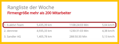 Doch wie lautet unser Endergebnis? Innerhalb von fünf Wochen hat das b.aktiv!-Teambeeindruckende 5.435,39 Kilometererlaufen! Mit dieser bemerkenswerten Leistung sicherten wir uns schlussendlich den1. Platz in der Kategorie „über 200 Mitarbeitende“. Bereits im vergangenen Jahr hatten wir mit unserem b.aktiv!-Team den dritten Platz belegt. Noch ein Grund mehr also, diese herausragende Leistung unserer Mitarbeiter*innen zu feiern.